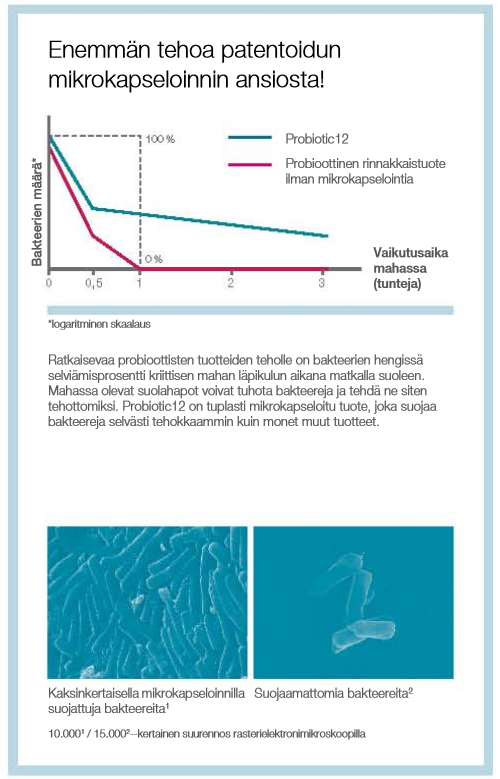 Ratkaisevaa probioottisten tuotteiden vaikuttavuudelle on bakteereiden eloonjäämisaste kriittisen mahan läpikulun aikana matkalla suoleen. Mahassa olevat suolahapot voivat tuhota bakteereita ja tehdä ne tehottomiksi. PRO12 on tuplasti mikrokapseloitu tuote, joka suojaa bakteereita selvästi tehokkaammin kuin monet muut tuotteet. Mikrokapselointi tarkoittaa, että se luovuttaa ohutsuolessa tasaisesti noin 5 tunnin ajan 12 eri bakteerikantaa. Tutkimuksissa PRO12 on ollut testivoittaja!